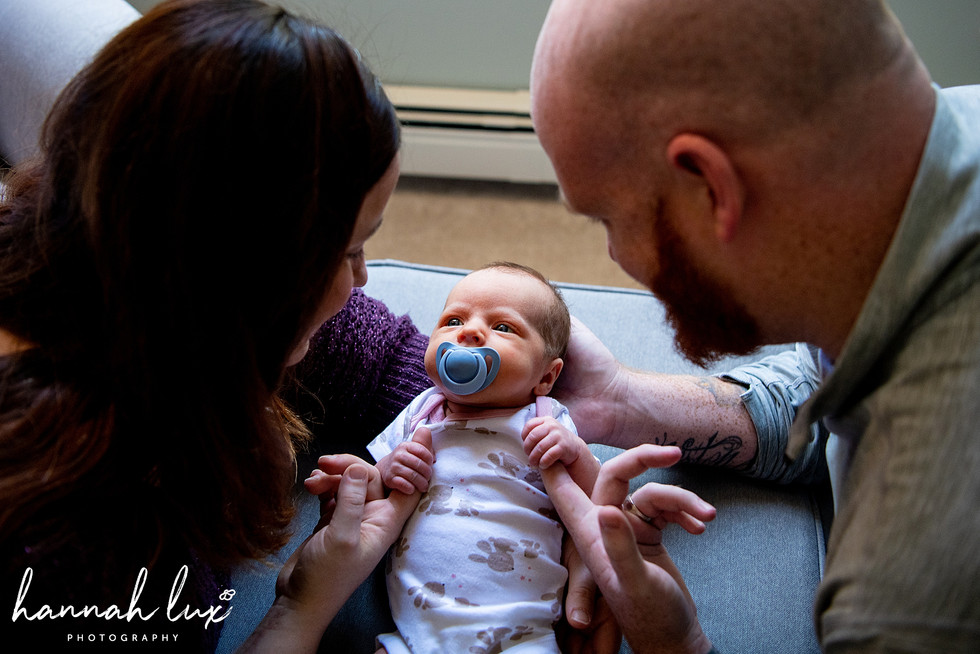 2. The lifestyle newborn session: an intimate at-home shoot taken anytime from a few days after birth to a few weeks from it. Babies don't necessarily have to be asleep for these, and are often looking around at mom and dad, into space, or into the camera. This shoot captures the baby & the family in their natural environment.